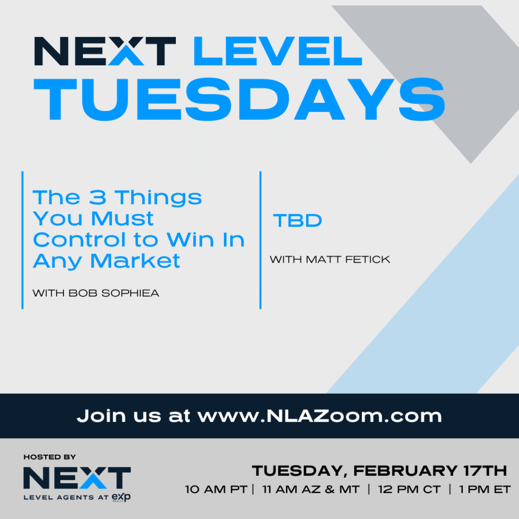 Join us for Next Level Tuesdays. This week we will be joined by Brandon Green as he shares the 5 Habits of Wealth Building, and Cole & Kelly Watkins will tell you how, in a down market, they still went up 56% last year.