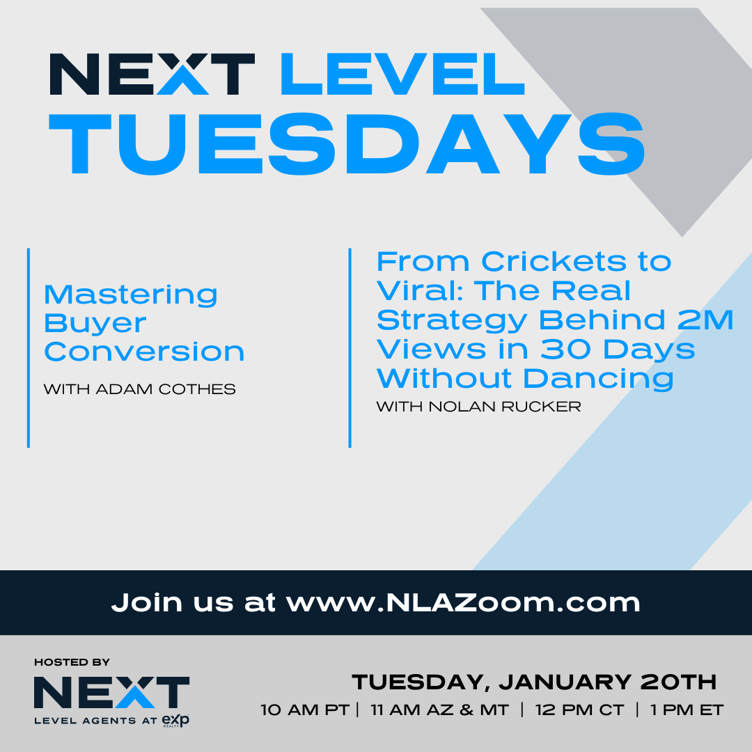 Join us on Tuesday, January 20th, for Next Level Tuesdays. This week, Adam Cothes will share his secrets for mastering buyer conversion, and Nolan Rucker will share his strategy for getting 2million views in 30days, without dancing. You don’t want to miss out. www.NLAZoom.com